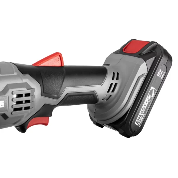 Akkus sarokcsiszoló 18V, Li-Ion, 115x22.2 mm tárcsa, fordulatszám 10000 min⁻¹, orsó menet M14, kétállású oldalsó markolat, (LxH) 320 x 130 mm, tömege 1.5 kg, kompatibilis az Energy+ akkumulátorokkal