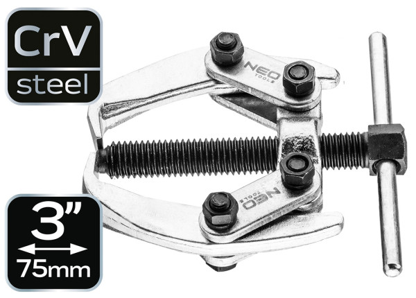 A NEO kétkörmös csapágylehúzó kiváló minőségű, a szerszámnak hosszú élettartamot biztosító króm-vanádium acélból készül. Közös tengelyen illesztett elemek elválasztására szolgál. A karok speciális profilú körmei védik az elválasztott elemeket a sérülésektől A termék kiváló minőségét és megbízhatóságát bizonyítja a TÜV Rheinland tanúsítvány. A NEO márka a professzionális igényeket is kielégíti.