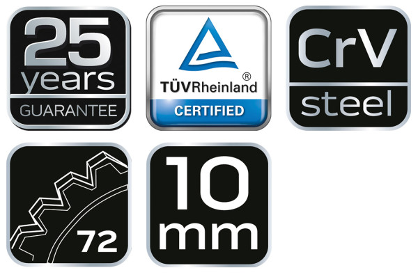 NEO racsnis csillag-villáskulcs. A csillagkulcs 72-fogas kilincsműve gyors, pontos munkát tesz lehetővé. A kiváló minőségű króm-vanádium acél sokéves tartósságot biztosít. A termék kiváló minőségét és megbízhatóságát bizonyítja a TÜV Rheinland tanúsítvány. A NEO márka a professzionális igényeket is kielégíti.