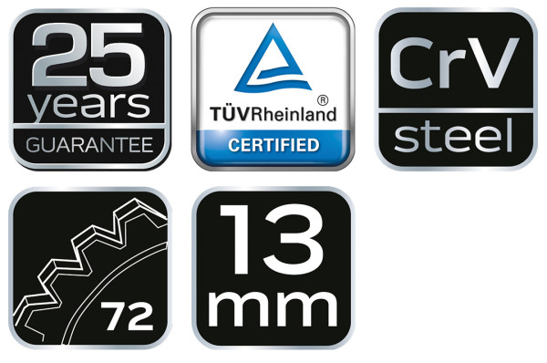 NEO racsnis csillag-villáskulcs. A csillagkulcs 72-fogas kilincsműve gyors, pontos munkát tesz lehetővé. A kiváló minőségű króm-vanádium acél sokéves tartósságot biztosít. A termék kiváló minőségét és megbízhatóságát bizonyítja a TÜV Rheinland tanúsítvány. A NEO márka a professzionális igényeket is kielégíti.
